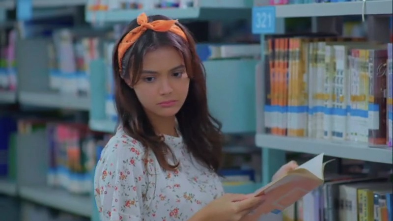 Pada hari di mana Lia mulai merasakan benih-benih cinta pada Arya, Lia mengenakan sleeveless long dress berwarna coklat yang dipadupadankan dengan blazer panjang berwarna cream. Untuk mematahkan kesan monokrom, ia menambahkan sling bag bulat berwarna hitam yang senada dengan high cut sneakers yang dikenakannya.